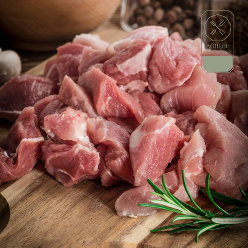 Type de viande et appellation des coupes : Agneau – âgé de moins de 8 mois – Découpe en cubes dans l’épaule et collier.